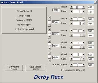 cheering sound) afterwards the background music resumes. The other version uses the amusement facility's own background music, routed through the line-in input in the PC's sound card, and when the game starts the background music is muted and a race song plays. Like the other version, at the end of the game it plays a song or sound file and then the background music fades back in. It is perfect, and other than the time in software development, cost almost nothing! Both versions have the ability to be programmed to adjust their loudness levels appropriately for different times of the day, i.e. quieter early in the morning and loudest during the busiest times. Also, as the PCs are on the location's network, we also are able to mute the background music automatically and remotely after the closing announcements. Pretty nifty eh! |